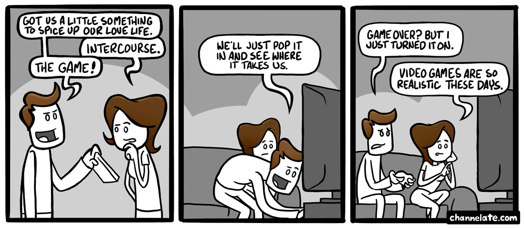 Intercourse: The Game. by Ryan on 2009/12/10 at 12:00 am Chapter: comics It’s Friday Eve once again, dudes. Shipping out another round of books today. Thanks, everybody! └ Tags: 3 panel, comics, intercourse, marriage, video games